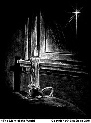 - The Light of the World (Graphite/ Adobe Photoshop) This peice was created to be the cover of a Christmas card. It is drawn in graphite on white paper and then inverted in color on computer. In other words, what is white above, was originally drawn in pencil... (...Notice the shadow of the cross?...)